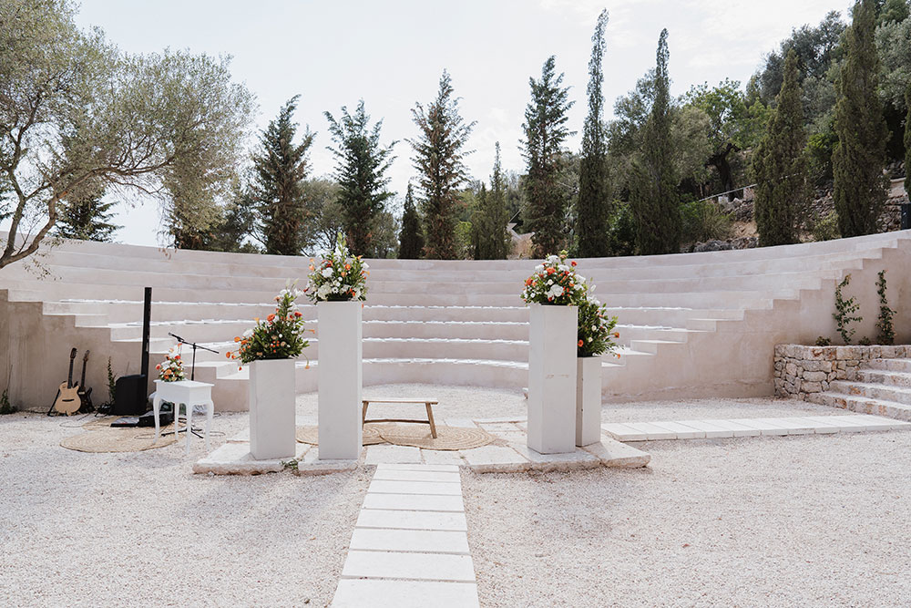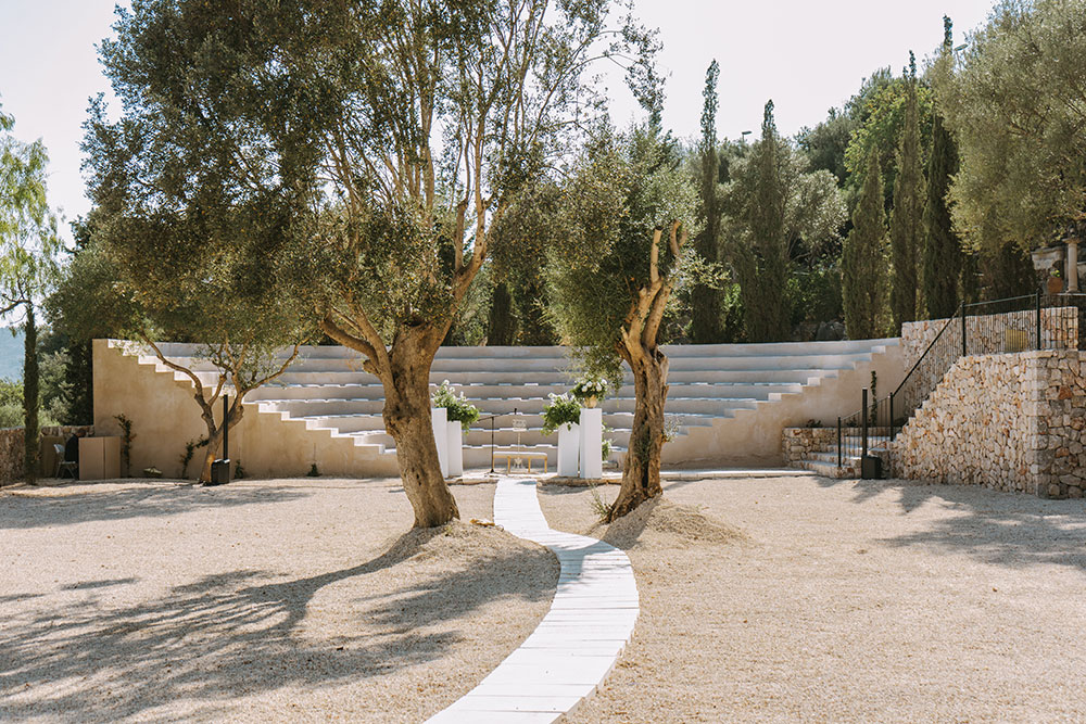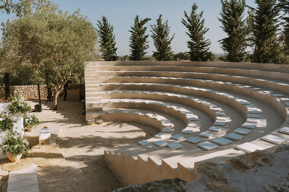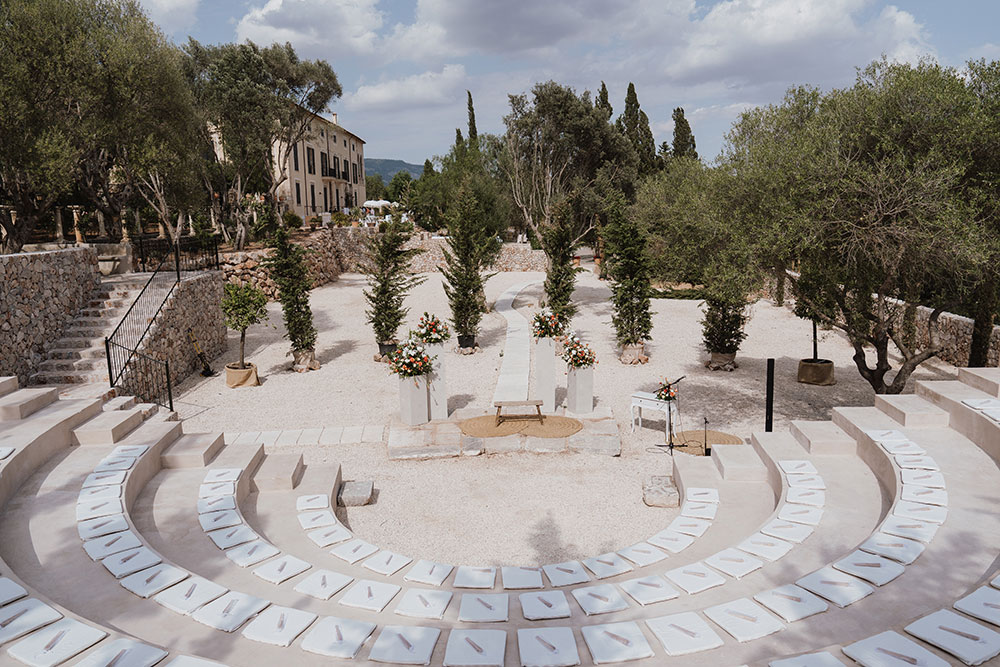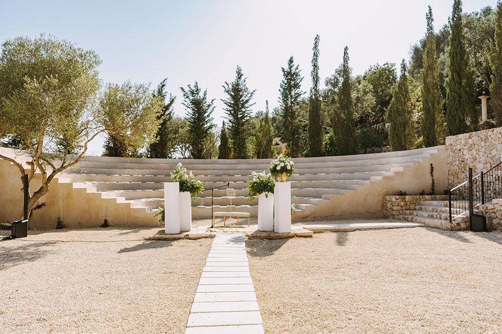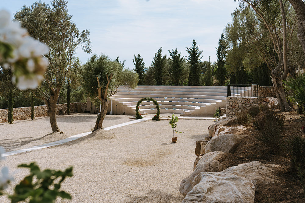 Si nos seguimos adentrando en el amplio jardín, atravesaremos un pasillo cubierto de pérgolas que abre paso hacia el anfiteatro, un lugar especial para poder celebrar una ceremonia civil o tal vez un concierto íntimo. Este espacio rodeado de flora autóctona brindará a tu ceremonia un ambiente familiar y mágico.