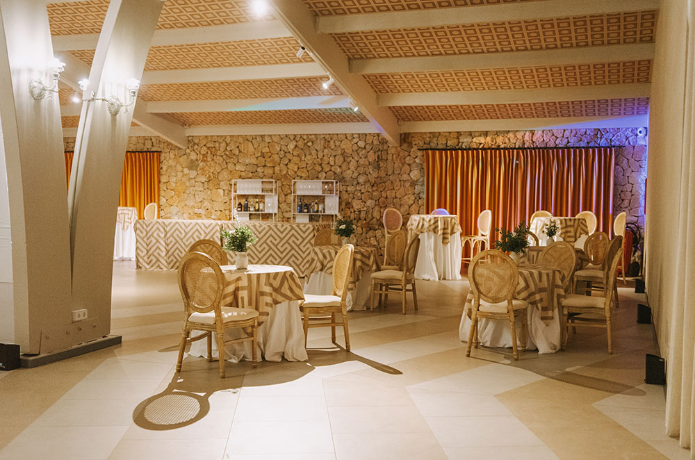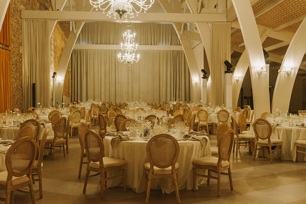 Desde la Clastra tenemos acceso al gran salón, que bajo sus altos techos enmarcados por arcos de madera maciza emulando la bella catedral de Palma, dan lugar a un espacio cálido para celebrar el banquete y la zona de baile.